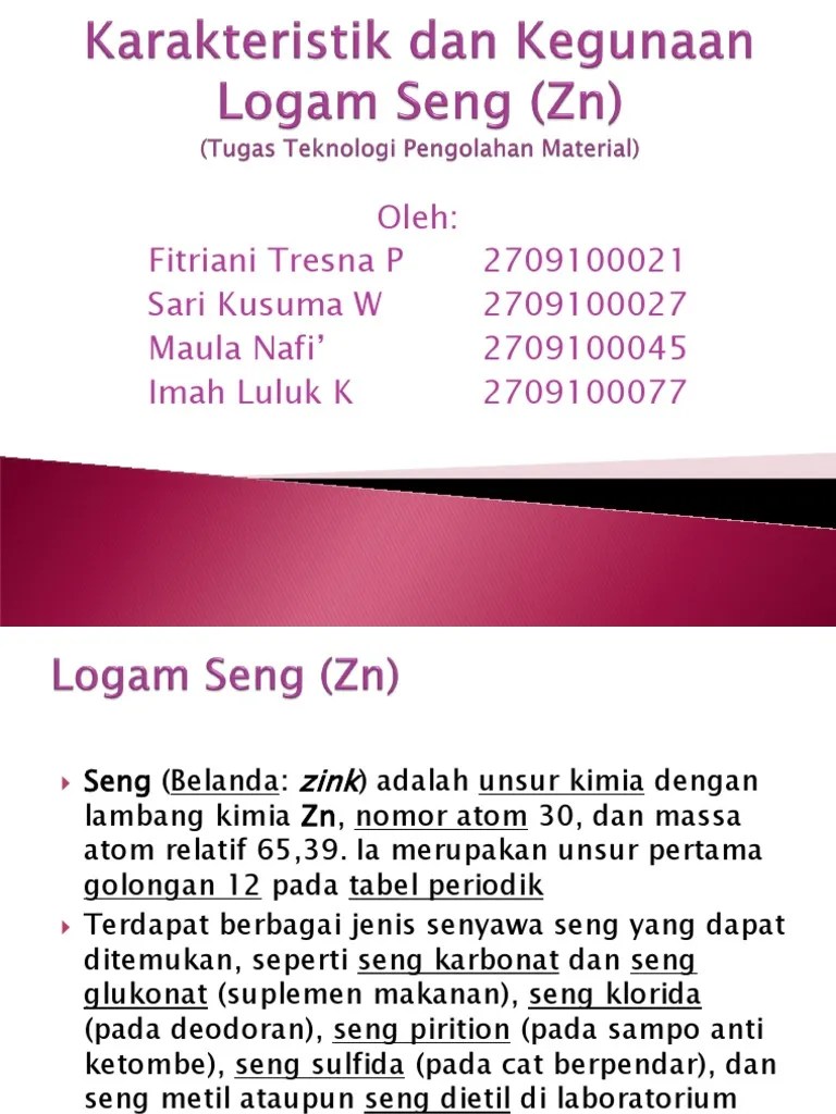 Ii.2.2 sifat logam seng (zn)... Logam ini berat, berwarna keperakan yang cair pada suhu normal. Selain itu, keduanya juga memiliki keadaan oksidasi +2. 23.09.2013 · kesimpulankesimpulan • seng merupakan unsur kimia dengan lambang kimia zn, nomor atom 30, dan massa atom relatif 65,39. Z adalah nomor atom untuk konfigurasi elektron, jadi jawaban tepat adalah co. Unsur bernomor atom 21 dan berlambang sc. Konfigurasi ion muatan 2+ menandakan terdapat dua elektron yang dilepaskan yaitu elektron pada kulit terluar yaitu pada.